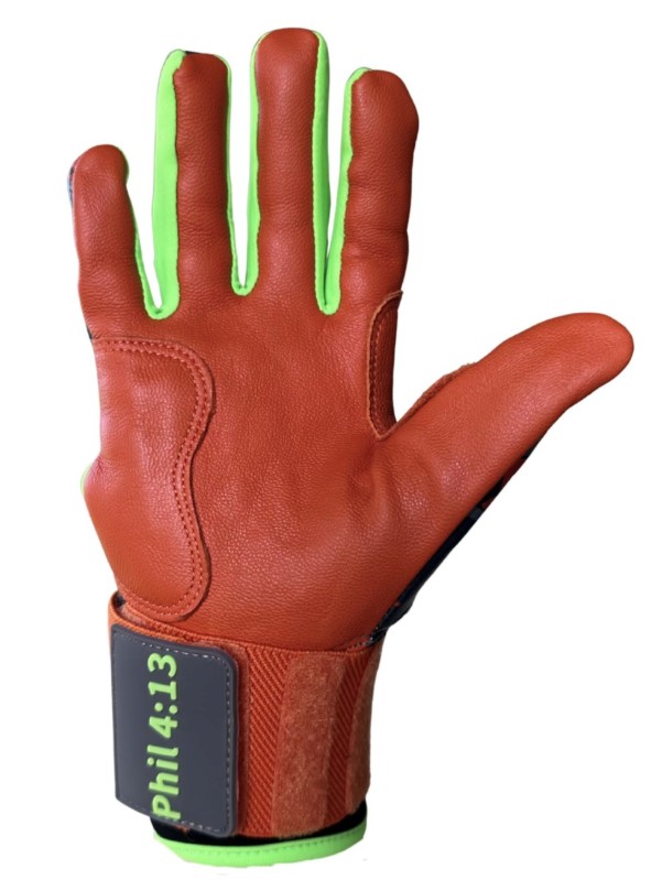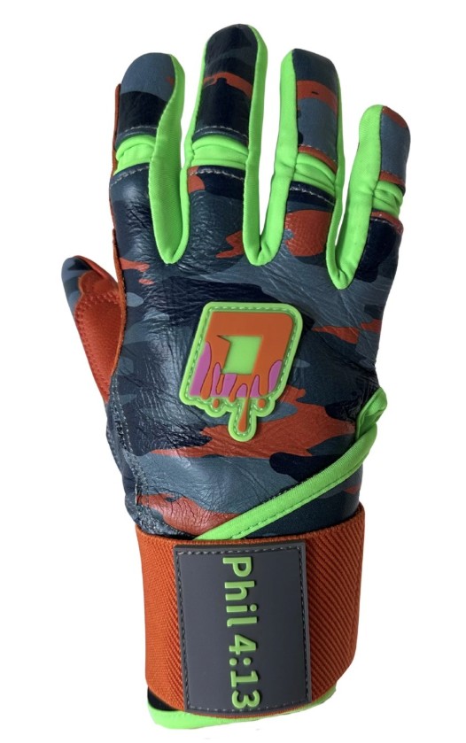 Featuring a bold camo and orange colorway, these gloves deliver standout style that commands attention every time you step into the box. More than just looks, they carry a deeper message—featuring the powerful reminder from Philippians 4:13: “I can do all things through Christ who strengthens me.”